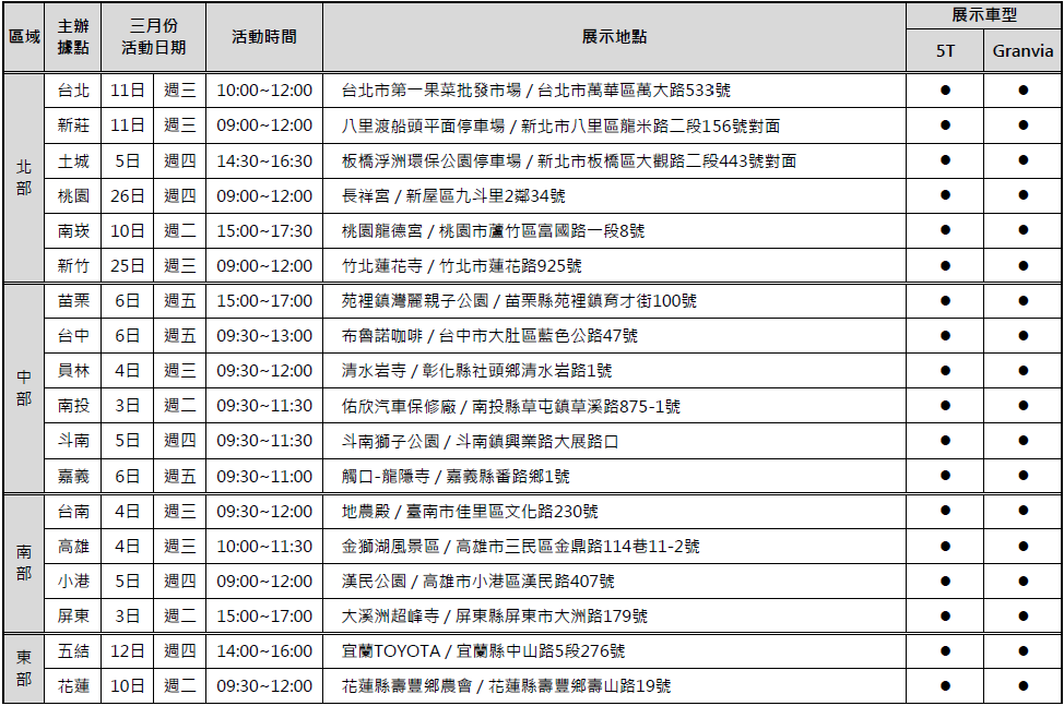 HINO 5噸、TOYOTA Granvia戶外微展車全台同步實施中,歡迎各地貴賓蒞臨鑑賞。