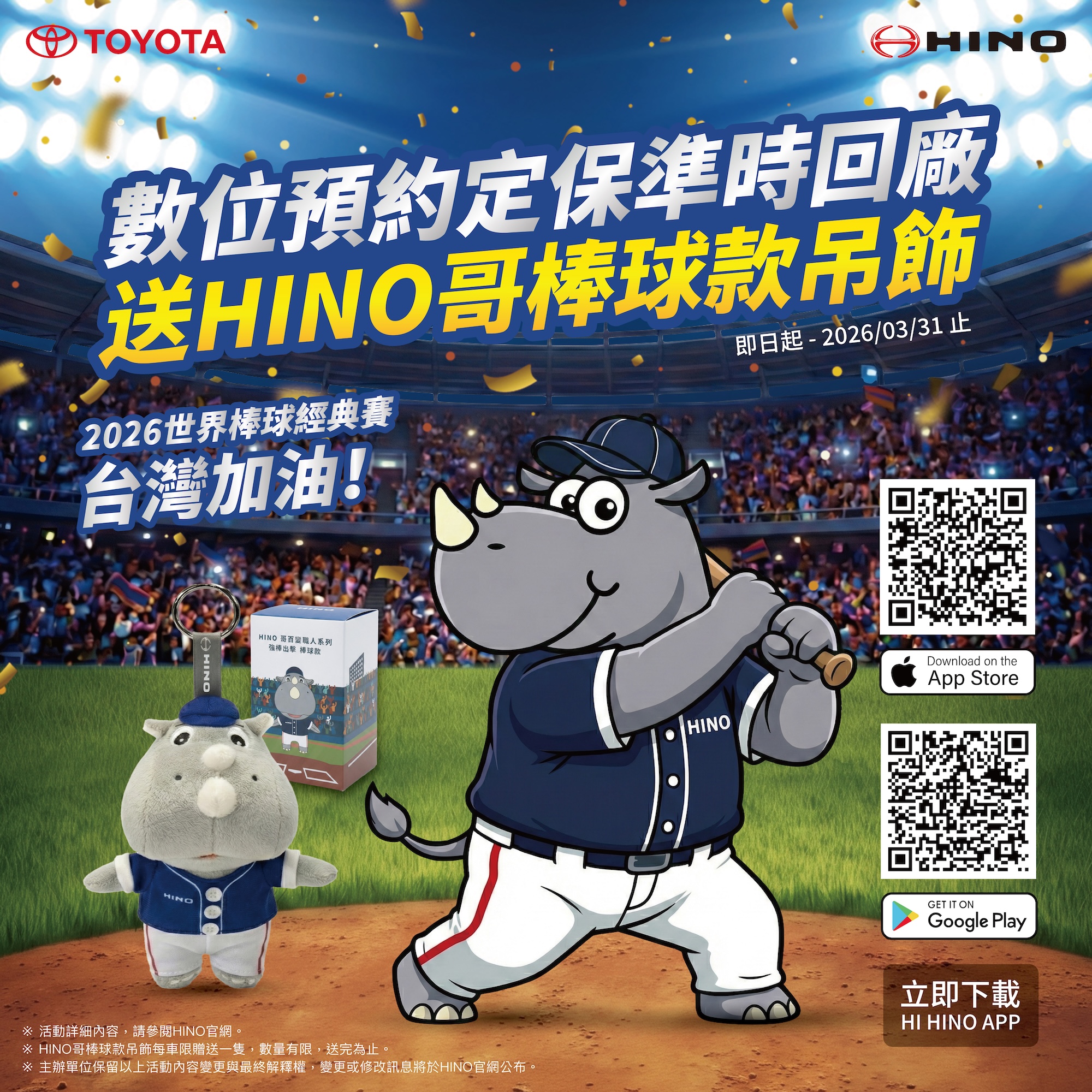 即日起至 3/31,透過 HI HINO APP 完成數位預約並「準時回廠」,超萌 HINO哥棒球款吊飾就跟你回家!數量有限,送完為止!