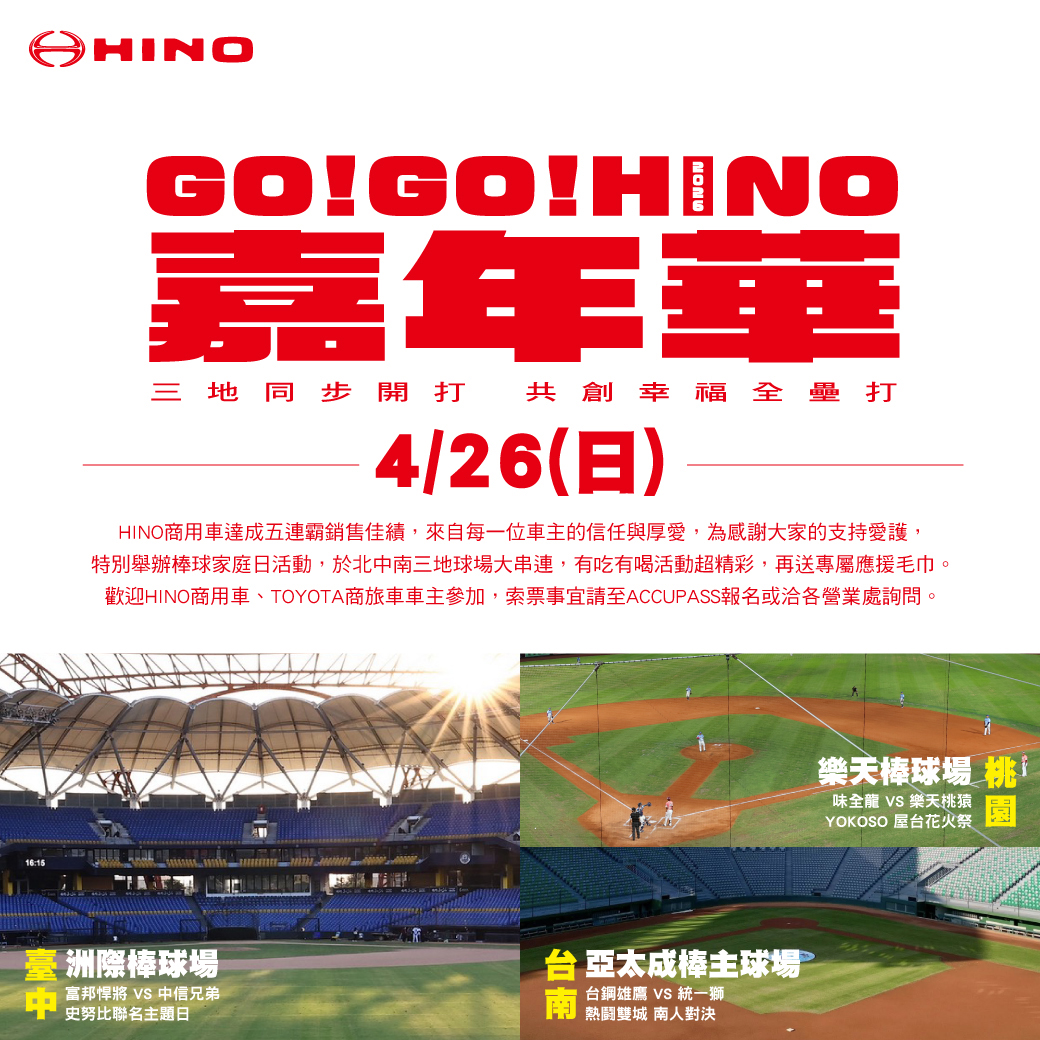 《2026 GO! GO! HINO嘉年華-棒球家庭日》將於3/25(三)17:00起開放線上ACCUPASS報名,誠摯邀請 HINO與TOYOTA商旅車車主共襄盛舉棒球家庭日應援盛事。詳細活動內容及報名方式請至HINO官網(https://www.hino.com.tw/)或粉絲專頁(https://www.facebook.com/hinotaiwan.official)查詢;或可洽和泰汽車所屬商用車經銷商-長源汽車、蘭揚汽車、東部汽車之營業據點,詢問索取門票事宜,門票數量有限,送完為止。